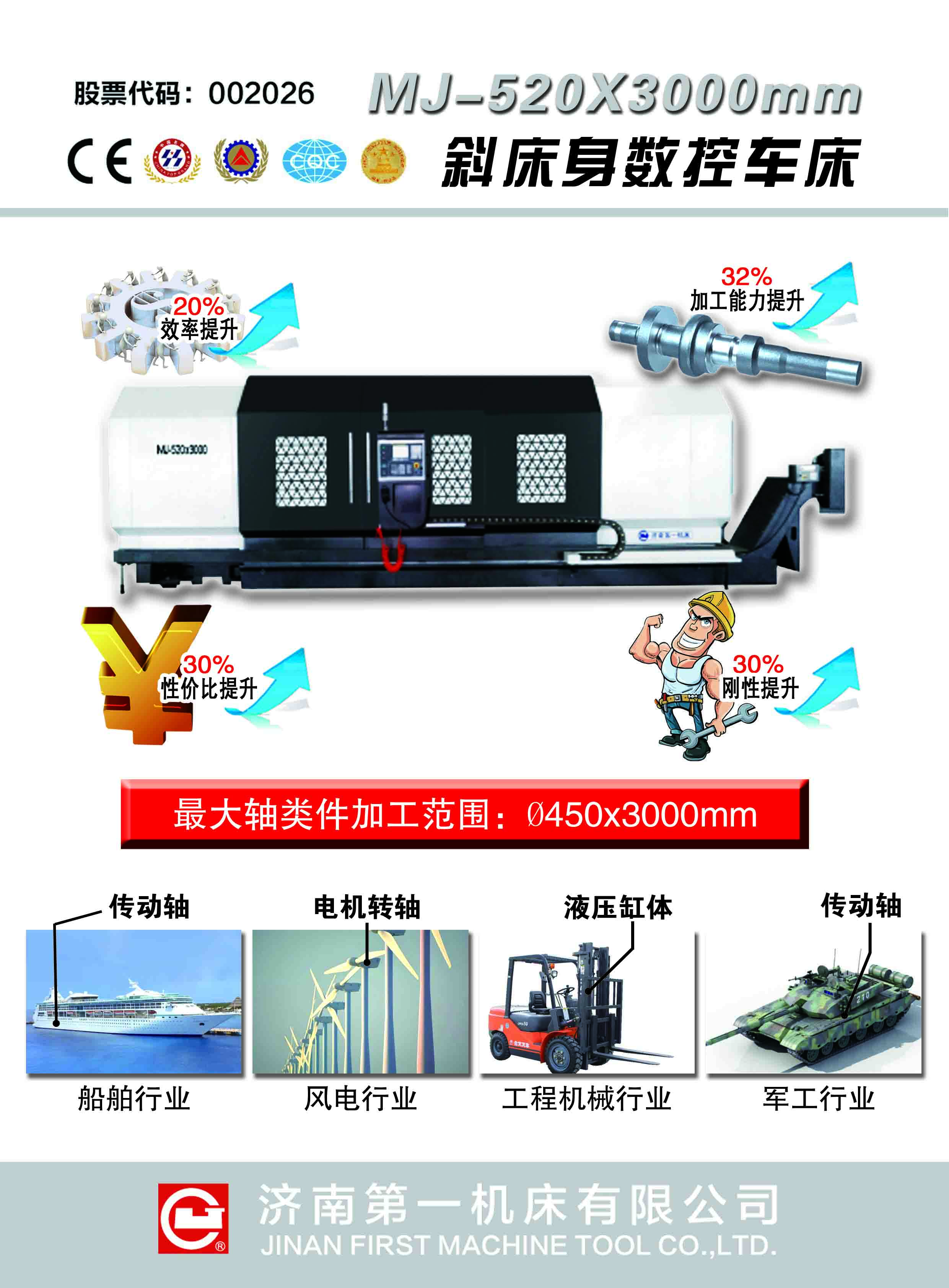 MJ-520系列精密數(shù)控車床是濟南一機床與美國M.M.T公司,以國際同類產(chǎn)品的先進水平為目標聯(lián)合開發(fā)設計的斜床身精密數(shù)控車床。本產(chǎn)品采用筒式筋板+密金格整體45°斜床身結(jié)構;剛性比上代提高30%以上;淬硬導軌,特別適合強力加工,且具有良好的精度保持性、穩(wěn)定性;全面的防護,主導軌和尾座導軌均帶有伸縮防護,配套噴淋系統(tǒng)可有效的解決積屑問題;時尚的全封閉防護,造型現(xiàn)代、美觀;新的防護結(jié)構,更能良好的防水、防屑;本機床還可選配不同的配置,特別是可選擇具有伺服進給的中心架或者帶有伺服進給、套筒伸縮功能的副主軸配置;副主軸可安裝卡盤或者頂尖,通過與主軸配合實現(xiàn)長軸工件的兩端同時夾持(漲緊),提高工件的剛性,減少撓度,提高工件的加工質(zhì)量和尺寸精度,有效解決長軸零件加工甩動慣性大、加工精度差的問題;特別適合長軸類的加工。本機床輔助功能強大,可參與自動化,進行流水線作業(yè)。